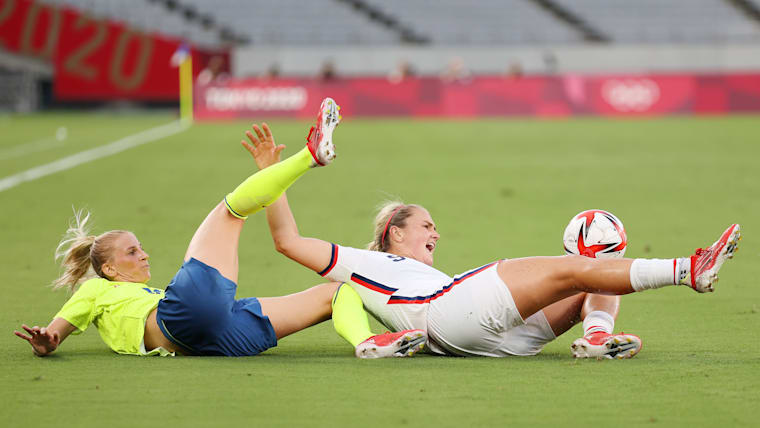 CHOFU, JAPAN - JULY 21: Crystal Dunn #2 of Team United States battles for possession with Sofia Jakobsson #10 of Team Sweden during the Women's First Round Group G match between Sweden and United States during the Tokyo 2020 Olympic Games at Tokyo Stadium on July 21, 2021 in Chofu, Tokyo, Japan. (Photo by Dan Mullan/Getty Images)