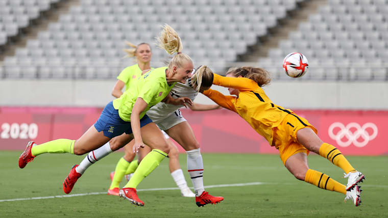 CHOFU, JAPAN - JULY 21: Stina Blackstenius #11 of Team Sweden scores their side's first goal past Alyssa Naeher #1 of Team United States during the Women's First Round Group G match between Sweden and United States during the Tokyo 2020 Olympic Games at Tokyo Stadium on July 21, 2021 in Chofu, Tokyo, Japan. (Photo by Dan Mullan/Getty Images)