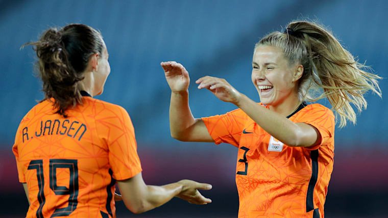 RIFU, MIYAGI, JAPAN - JULY 21: Victoria Pelova #13 of Team Netherlands celebrates with teammate Renate Jansen #19 after scoring their side's tenth goal during the Women's First Round Group F match between Zambia and Netherlands during the Tokyo 2020 Olympic Games at Miyagi Stadium on July 21, 2021 in Rifu, Miyagi, Japan. (Photo by Koki Nagahama/Getty Images)