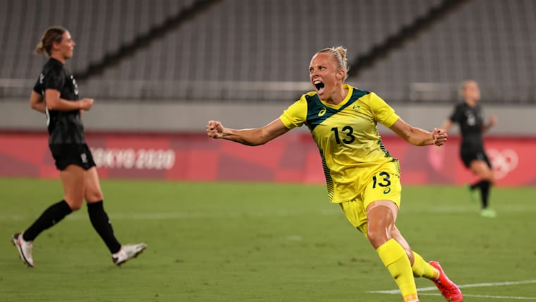 CHOFU, JAPAN - JULY 21: Tameka Yallop #13 of Team Australia celebrates after scoring their side's first goal during the Women's First Round Group G match between Australia and New Zealand during the Tokyo 2020 Olympic Games at Tokyo Stadium on July 21, 2021 in Chofu, Tokyo, Japan. (Photo by Dan Mullan/Getty Images)