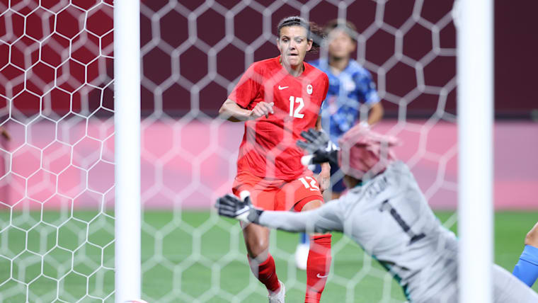 SAPPORO, JAPAN - JULY 21: Christine Sinclair #12 of Team Canada scores their side's first goal during the Women's First Round Group E match between Japan and Canada during the Tokyo 2020 Olympic Games at Sapporo Dome on July 21, 2021 in Sapporo, Hokkaido, Japan. (Photo by Masashi Hara/Getty Images)