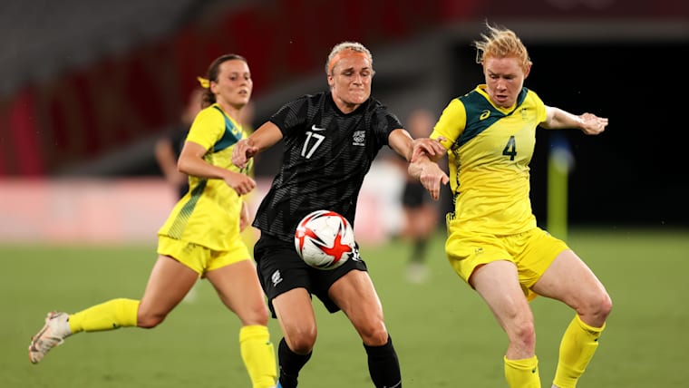 CHOFU, JAPAN - JULY 21: Hannah Wilkinson #17 of Team New Zealand battles for possession with Clare Polkinghorne #4 of Team Australia during the Women's First Round Group G match between Australia and New Zealand during the Tokyo 2020 Olympic Games at Tokyo Stadium on July 21, 2021 in Chofu, Tokyo, Japan. (Photo by Dan Mullan/Getty Images)