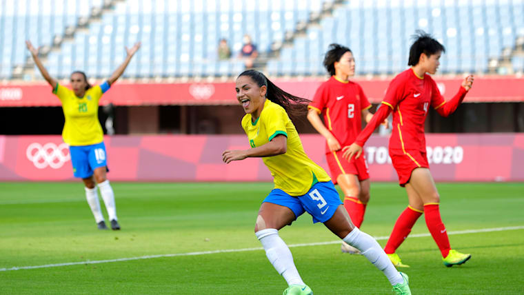 RIFU, MIYAGI, JAPAN - JULY 21: Debinha #9 of Team Brazil celebrates after scoring their side's second goal during the Women's First Round Group F match between China and Brazil during the Tokyo 2020 Olympic Games at Miyagi Stadium on July 21, 2021 in Rifu, Miyagi, Japan. (Photo by Koki Nagahama/Getty Images)