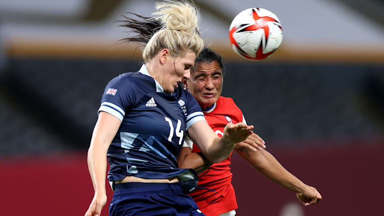 SAPPORO, JAPAN - JULY 21: Millie Bright #14 of Team Great Britain competes for a header with Jose Urrutia Maria #9 of Team Chile during the Women's First Round Group E match between Great Britain and Chile during the Tokyo 2020 Olympic Games at Sapporo Dome on July 21, 2021 in Sapporo, Hokkaido, Japan. (Photo by Masashi Hara/Getty Images)