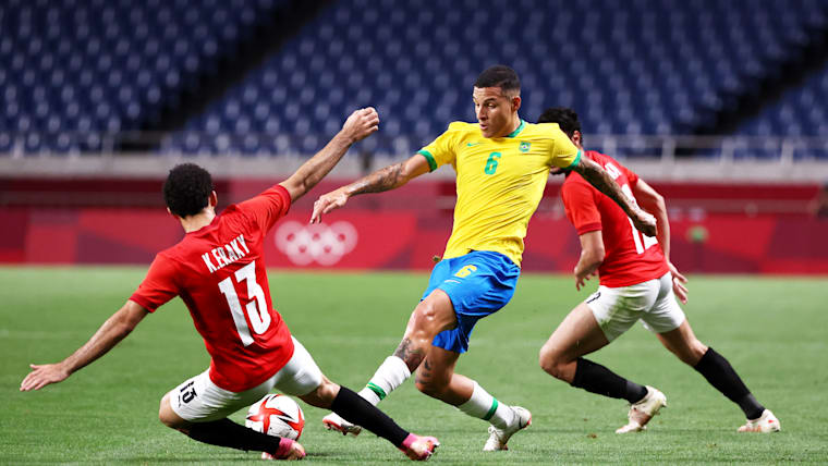 SAITAMA, JAPAN - JULY 31: Guilherme Arana #6 of Team Brazil is challenged by Karim Eraky #13 of Team Egypt during the Men's Quarter Final between Brazil and Egypt on day eight of the Tokyo Olympic Games at Saitama Stadium on July 31, 2021 in Saitama, Japan. (Photo by Buda Mendes/Getty Images)