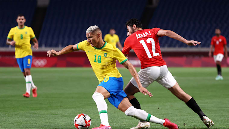 SAITAMA, JAPAN - JULY 31: Richarlison #10 of Team Brazil battles for possession with Akram Tawfik #12 of Team Egypt during the Men's Quarter Final between Brazil and Egypt on day eight of the Tokyo Olympic Games at Saitama Stadium on July 31, 2021 in Saitama, Japan. (Photo by Buda Mendes/Getty Images)