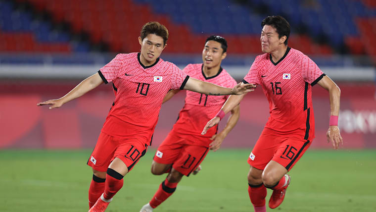 YOKOHAMA, JAPAN - JULY 31: Donggyeong Lee #10 of Team South Korea celebrates with teammates Uijo Hwang #16, Dongjun Lee #11 and Yoonseong Kang #19 after scoring their side's first goal during the Men's Quarter Final match between Republic Of Korea and Mexico on day eight of the Tokyo 2020 Olympic Games at International Stadium Yokohama on July 31, 2021 in Yokohama, Kanagawa, Japan. (Photo by Francois Nel/Getty Images)
