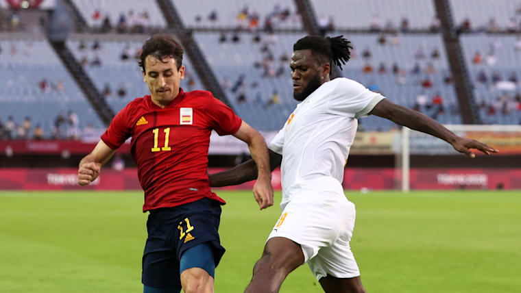 RIFU, MIYAGI, JAPAN - JULY 31: Mikel Oyarzabal #11 of Team Spain is challenged by Franck Kessie #8 of Team Ivory Coast during the Men's Quarter Final match between Spain and Cote d'Ivoire on day eight of the Tokyo 2020 Olympic Games at Miyagi Stadium on July 31, 2021 in Rifu, Miyagi, Japan. (Photo by Koki Nagahama/Getty Images)