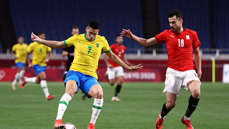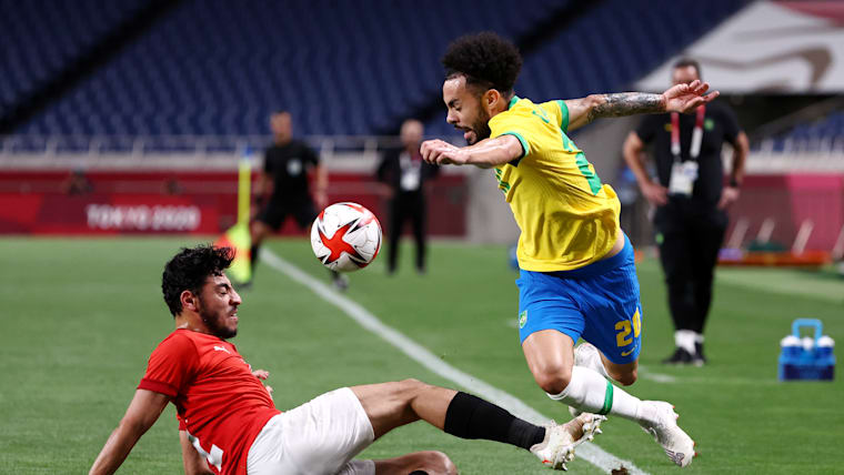 SAITAMA, JAPAN - JULY 31: Claudinho #20 of Team Brazil is challenged by Akram Tawfik #12 of Team Egypt during the Men's Quarter Final between Brazil and Egypt on day eight of the Tokyo Olympic Games at Saitama Stadium on July 31, 2021 in Saitama, Japan. (Photo by Buda Mendes/Getty Images)