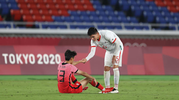 YOKOHAMA, JAPAN - JULY 31: Jinya Kim #13 of Team South Korea is consoled by Vladimir Lorona #6 of Team Mexico following defeat in the Men's Quarter Final match between Republic Of Korea and Mexico on day eight of the Tokyo 2020 Olympic Games at International Stadium Yokohama on July 31, 2021 in Yokohama, Kanagawa, Japan. (Photo by Francois Nel/Getty Images)