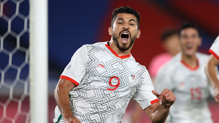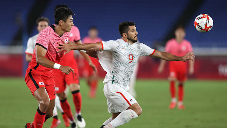 YOKOHAMA, JAPAN - JULY 31: Henry Martin #9 of Team Mexico holds off Taewook Jeong #5 of Team South Korea during the Men's Quarter Final match between Republic Of Korea and Mexico on day eight of the Tokyo 2020 Olympic Games at International Stadium Yokohama on July 31, 2021 in Yokohama, Kanagawa, Japan. (Photo by Francois Nel/Getty Images)