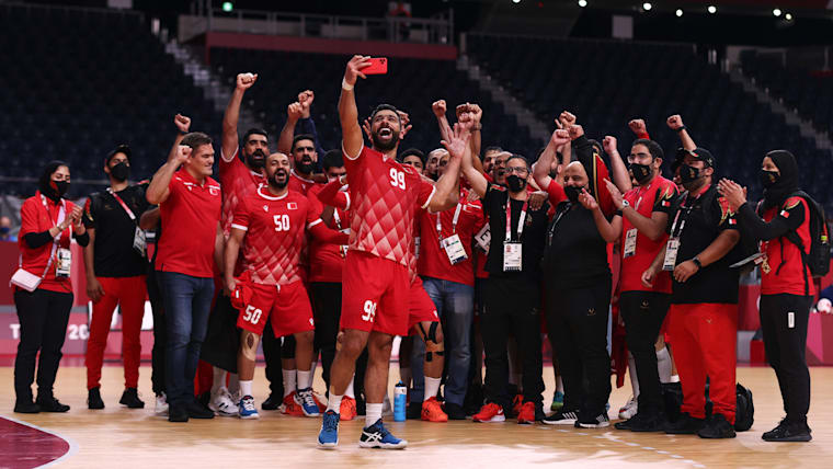 TOKYO, JAPAN - JULY 30: Husain Alsayyad of Team Bahrain takes a selfie with his teammates and staff after winning the Men's Preliminary Round Group B handball match between Bahrain and Japan on day seven of the Tokyo 2020 Olympic Games at Yoyogi National Stadium on July 30, 2021 in Tokyo, Japan. (Photo by Dean Mouhtaropoulos/Getty Images)