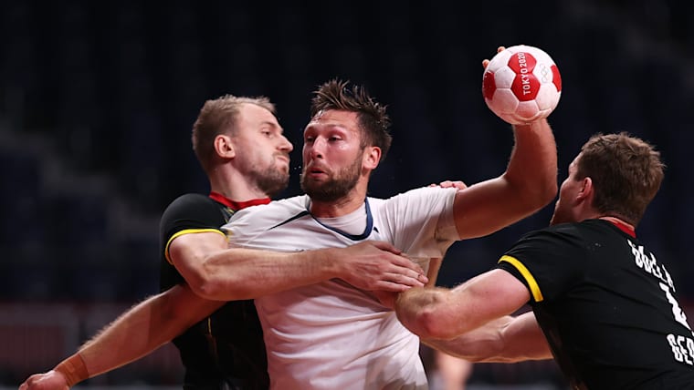TOKYO, JAPAN - JULY 30: Harald Reinkind of Team Norway is challenged by Julius Kuhn and Johannes Golla of Team Germany during the Men's Preliminary Round Group A handball match between Germany and Norway on day seven of the Tokyo 2020 Olympic Games at Yoyogi National Stadium on July 30, 2021 in Tokyo, Japan. (Photo by Dean Mouhtaropoulos/Getty Images)