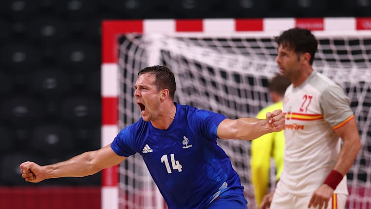 TOKYO, JAPAN - JULY 30: Kentin Mahe of Team France celebrates after scoring a goal during the Men's Preliminary Round Group A handball match between France and Spain on day seven of the Tokyo 2020 Olympic Games at Yoyogi National Stadium on July 30, 2021 in Tokyo, Japan. (Photo by Dean Mouhtaropoulos/Getty Images)