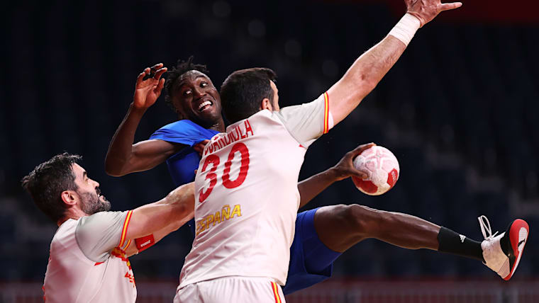 TOKYO, JAPAN - JULY 30: Luc Abalo of Team France shoots at goal over Raul Entrerrios Rodriguez and Gedeon Guardiola Villaplana of Team Spain during the Men's Preliminary Round Group A handball match between France and Spain on day seven of the Tokyo 2020 Olympic Games at Yoyogi National Stadium on July 30, 2021 in Tokyo, Japan. (Photo by Dean Mouhtaropoulos/Getty Images)
