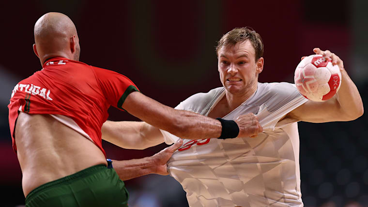 TOKYO, JAPAN - JULY 30: Mathias Gidsel of Team Denmark is challenged by Joao Ferraz of Team Portugal during the Men's Preliminary Round Group B handball match between Portugal and Denmark on day seven of the Tokyo 2020 Olympic Games at Yoyogi National Stadium on July 30, 2021 in Tokyo, Japan. (Photo by Dean Mouhtaropoulos/Getty Images)