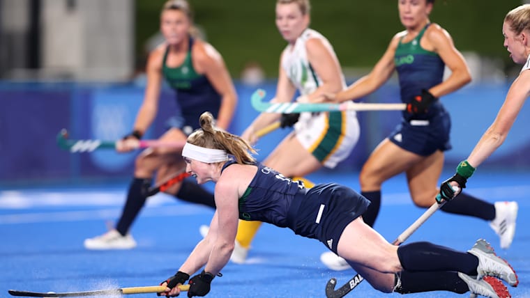 TOKYO, JAPAN - JULY 24: Naomi Carroll of Team Ireland jumps for the ball during the Women's Preliminary Pool A match between Ireland and South Africa on day one of the Tokyo 2020 Olympic Games at Oi Hockey Stadium on July 24, 2021 in Tokyo, Japan. (Photo by Alexander Hassenstein/Getty Images)