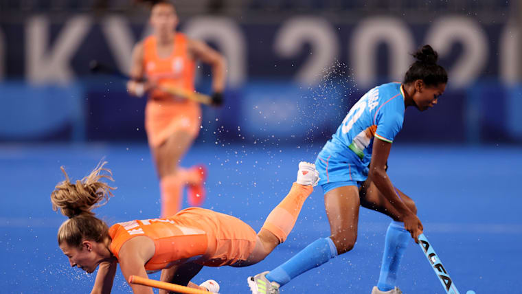 TOKYO, JAPAN - JULY 24: Xan Gerdien de Waard of Team Netherlands and Salima Tete of Team India battle for the ball during the Women's Preliminary Pool A match between the Netherlands and India on day one of the Tokyo 2020 Olympic Games at Oi Hockey Stadium on July 24, 2021 in Tokyo, Japan. (Photo by Dan Mullan/Getty Images)
