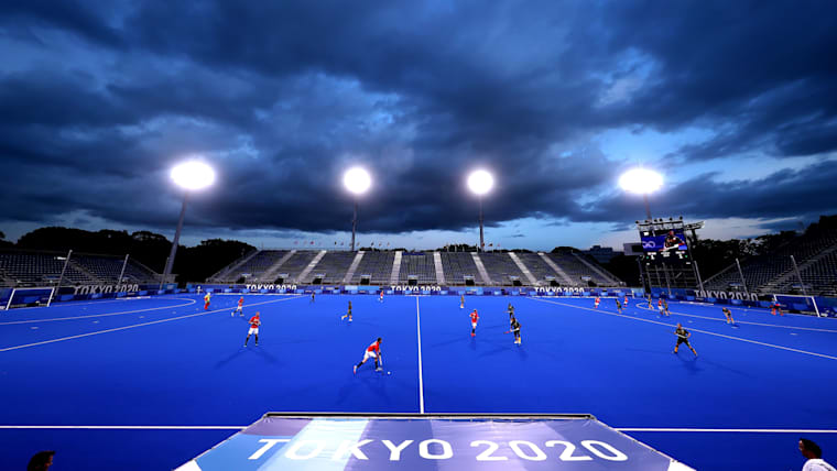 TOKYO, JAPAN - JULY 24: Great Britain push during the Men's Preliminary Pool B match between Great Britain and South Africa on day one of the Tokyo 2020 Olympic Games at Oi Hockey Stadium on July 24, 2021 in Tokyo, Japan. (Photo by Alexander Hassenstein/Getty Images)