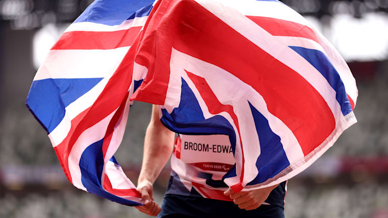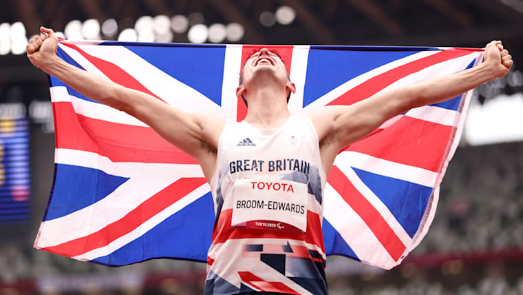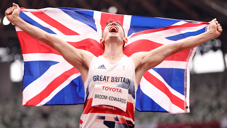 TOKYO, JAPAN - SEPTEMBER 03: Jonathan Broom-Edwards of Team Great Britain celebrates winning the gold medal after competing in the Men's High Jump - T64 final on day 10 of the Tokyo 2020 Paralympic Games at the Olympic Stadium on September 03, 2021 in Tokyo, Japan. (Photo by Lintao Zhang/Getty Images)