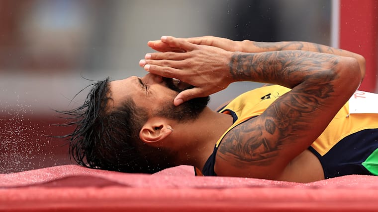 TOKYO, JAPAN - SEPTEMBER 03: Joehsah Beserra dos Santos of Team Brazil reacts while competing in the Men's High Jump - T64 final on day 10 of the Tokyo 2020 Paralympic Games at Ariake Tennis Park on September 03, 2021 in Tokyo, Japan. (Photo by Buda Mendes/Getty Images)