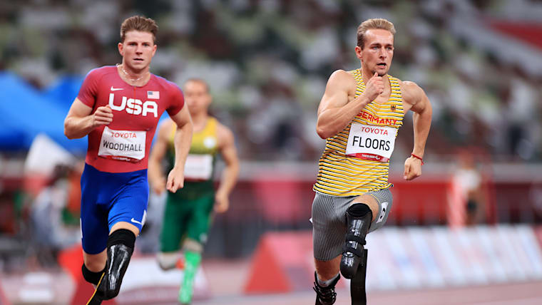 TOKYO, JAPAN - SEPTEMBER 03: Hunter Woodhall (L) of Team United States and Johannes Floors (R) of Team Germany compete in the Men's 400m - T62 Final on day 10 of the Tokyo 2020 Paralympic Games at the Olympic Stadium on September 03, 2021 in Tokyo, Japan. (Photo by Carmen Mandato/Getty Images)