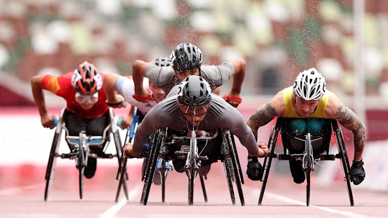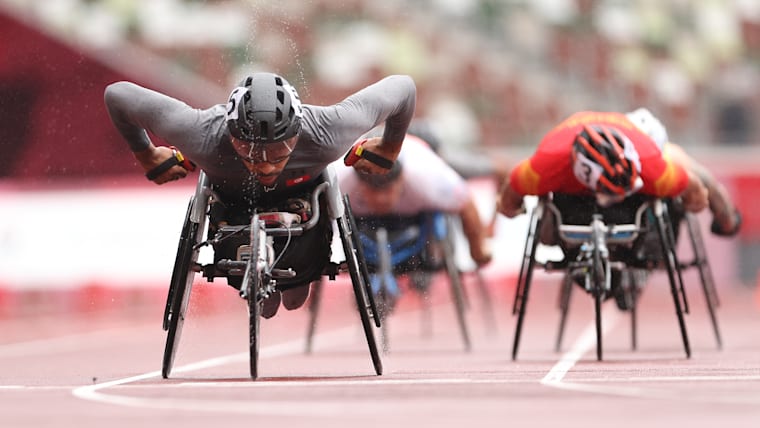 TOKYO, JAPAN - SEPTEMBER 03: Walid Ktila of Team Tunisia crosses the finish line in the Men's 800m - T34 heat on day 10 of the Tokyo 2020 Paralympic Games at Olympic Stadium on September 03, 2021 in Tokyo, Japan. (Photo by Lintao Zhang/Getty Images)