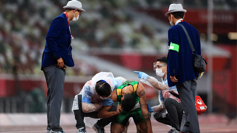 TOKYO, JAPAN - SEPTEMBER 03: Rodrigo Parreira da Silva of Team Brazil is attended to by medical staff after competing in the Men's 100m - T36 heats on day 10 of the Tokyo 2020 Paralympic Games at the Olympic Stadium on September 03, 2021 in Tokyo, Japan. (Photo by Buda Mendes/Getty Images)