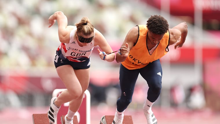 TOKYO, JAPAN - SEPTEMBER 03: Libby Clegg of Team Great Britain and her guide Chris Clarke competes in the 4x100m Universal Relay heat on day 10 of the Tokyo 2020 Paralympic Games at the Olympic Stadium on September 03, 2021 in Tokyo, Japan. (Photo by Lintao Zhang/Getty Images)