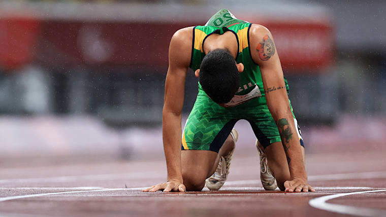 TOKYO, JAPAN - SEPTEMBER 03: Rodrigo Parreira da Silva of Team Brazil reacts after competing in the Men's 100m - T36 heats on day 10 of the Tokyo 2020 Paralympic Games at the Olympic Stadium on September 03, 2021 in Tokyo, Japan. (Photo by Buda Mendes/Getty Images)