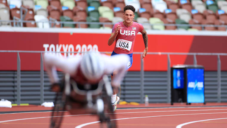 TOKYO, JAPAN - SEPTEMBER 03: Nick Mayhugh of Team United States runs toward Tatyana McFadden in the 4x100m Universal Relay heat on day 10 of the Tokyo 2020 Paralympic Games at the Olympic Stadium on September 03, 2021 in Tokyo, Japan. (Photo by Carmen Mandato/Getty Images)