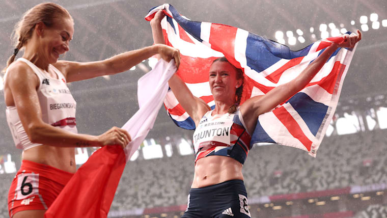 TOKYO, JAPAN - SEPTEMBER 03: Gold medalist Barbara Bieganowska-Zajac (L) of Team Poland and bronze medalist Hannah Taunton (R) of Team Great Britain celebrate after competing in the Women's 1500m - T20 Final on day 10 of the Tokyo 2020 Paralympic Games at Olympic Stadium on September 03, 2021 in Tokyo, Japan. (Photo by Lintao Zhang/Getty Images)