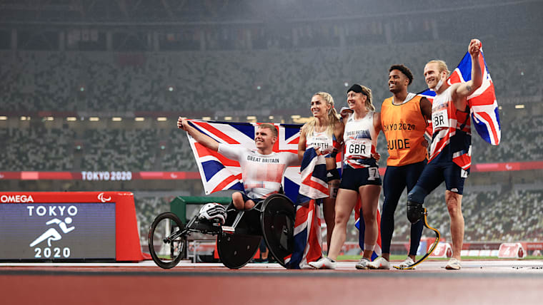 (L-R) Nathan McGuire, Ali Smith, Libby Clegg, guide Chris Clarke and Jonnie Peacock of Team Great Britain celebrate after winning silver in the 4x100m Universal Relay at the Tokyo 2020 Paralympic Games (Photo by Buda Mendes/Getty Images)