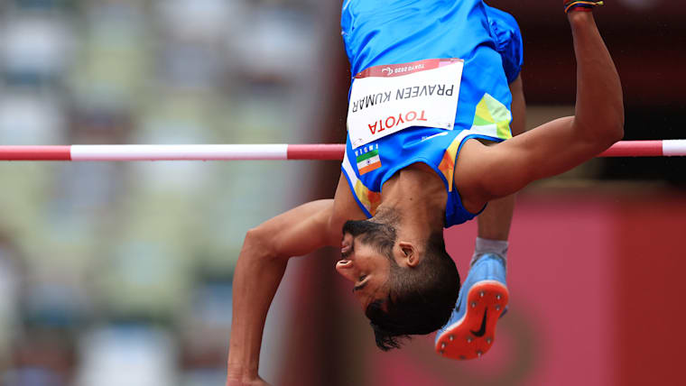 TOKYO, JAPAN - SEPTEMBER 03: Praveen Kumar Praveen Kumar of Team India competes in the Men's High Jump - T64 final on day 10 of the Tokyo 2020 Paralympic Games at Ariake Tennis Park on September 03, 2021 in Tokyo, Japan. (Photo by Buda Mendes/Getty Images)