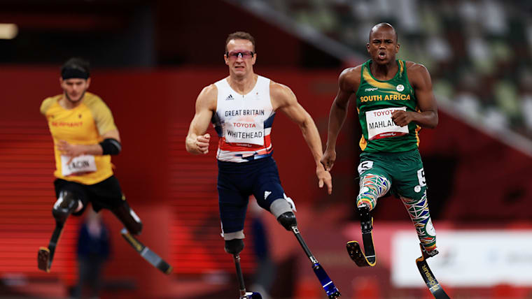 TOKYO, JAPAN - SEPTEMBER 03: Richard Whiltehead (C) of Team Great Britain and Ntando Mahlangu (R) of Team South Africa compete in the Men's 200m - T61 Final on day 10 of the Tokyo 2020 Paralympic Games at the Olympic Stadium on September 03, 2021 in Tokyo, Japan. (Photo by Buda Mendes/Getty Images)