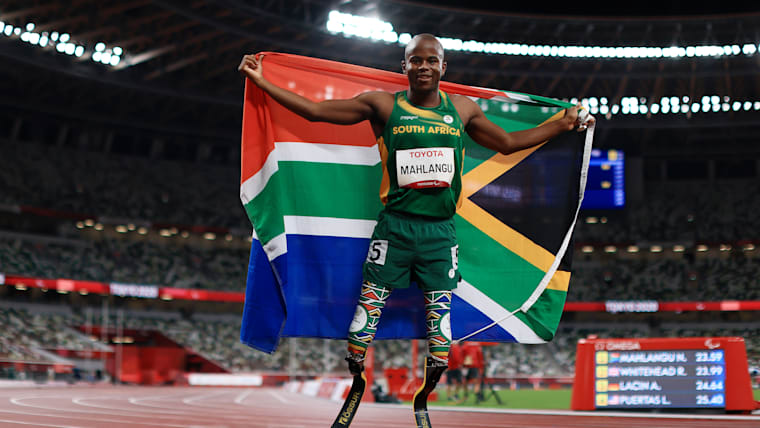 TOKYO, JAPAN - SEPTEMBER 03: Ntando Mahlangu of Team South Africa celebrates the gold medal in the Men's 200m - T61 on day 10 of the Tokyo 2020 Paralympic Games at the Olympic Stadium on September 03, 2021 in Tokyo, Japan. (Photo by Buda Mendes/Getty Images)