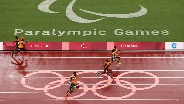 TOKYO, JAPAN - SEPTEMBER 03: Sprinters compete in the Men's 100m - T36 heat on day 10 of the Tokyo 2020 Paralympic Games at the Olympic Stadium on September 03, 2021 in Tokyo, Japan. (Photo by Carmen Mandato/Getty Images)