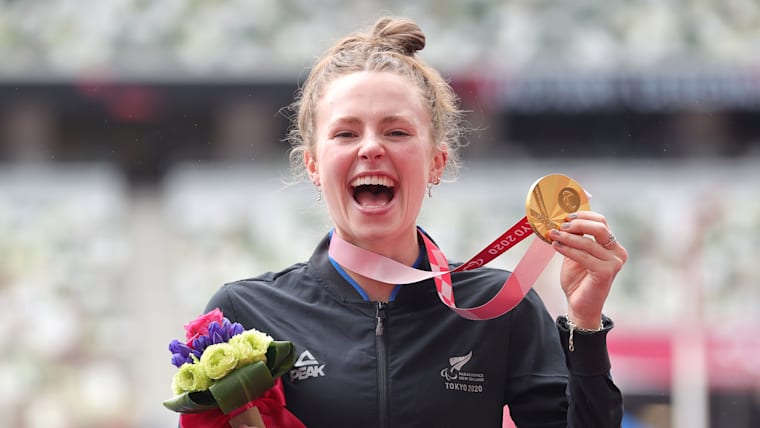 TOKYO, JAPAN - SEPTEMBER 03: Gold medalist Anna Grimaldi of Team New Zealand reacts during the Women's Long Jump - T47 medal ceremony on day 10 of the Tokyo 2020 Paralympic Games at the Olympic Stadium on September 03, 2021 in Tokyo, Japan. (Photo by Carmen Mandato/Getty Images)