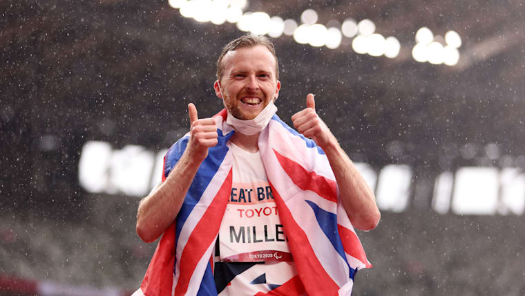 TOKYO, JAPAN - SEPTEMBER 03: Owen Miller of Team Great Britain celebrates winning the gold medal after competing in the Men's 1500m - T20 Final on day 10 of the Tokyo 2020 Paralympic Games at Olympic Stadium on September 03, 2021 in Tokyo, Japan. (Photo by Lintao Zhang/Getty Images)