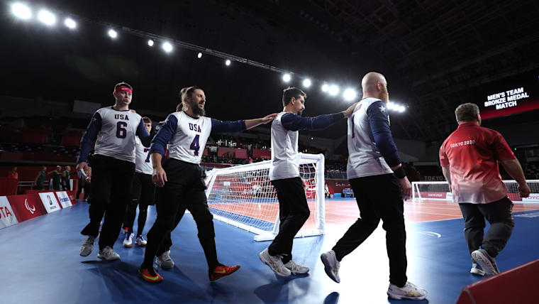 CHIBA, JAPAN - SEPTEMBER 03: Daryl Walker #1 of Team United States celebrates after scoring a goal in the second half against Team Lithuania in the men's Goalball bronze medal match on day 10 of the Tokyo 2020 Paralympic Games at Makuhari Messe Hall on September 03, 2021 in Chiba, Japan. (Photo by Kiyoshi Ota/Getty Images)