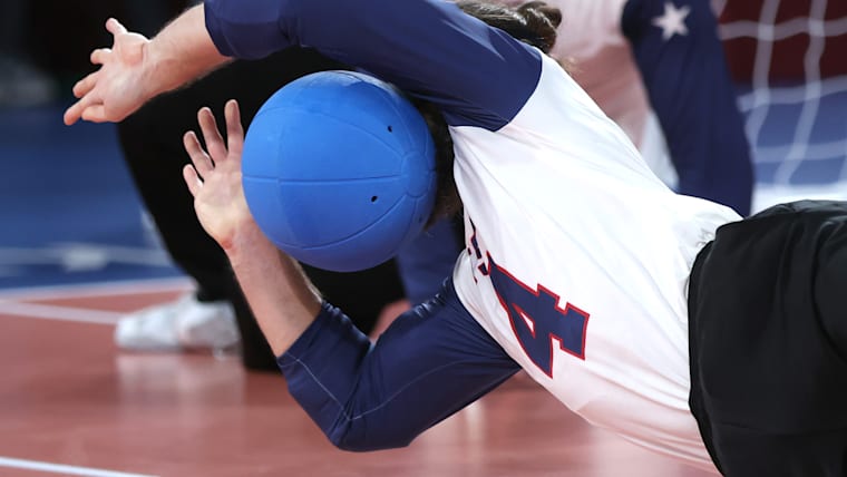 CHIBA, JAPAN - SEPTEMBER 03: John Kusku #4 of Team United States makes a save against Team Lithuania on day 10 of the Tokyo 2020 Paralympic Games at Makuhari Messe Hall on September 03, 2021 in Chiba, Japan. (Photo by Kiyoshi Ota/Getty Images)