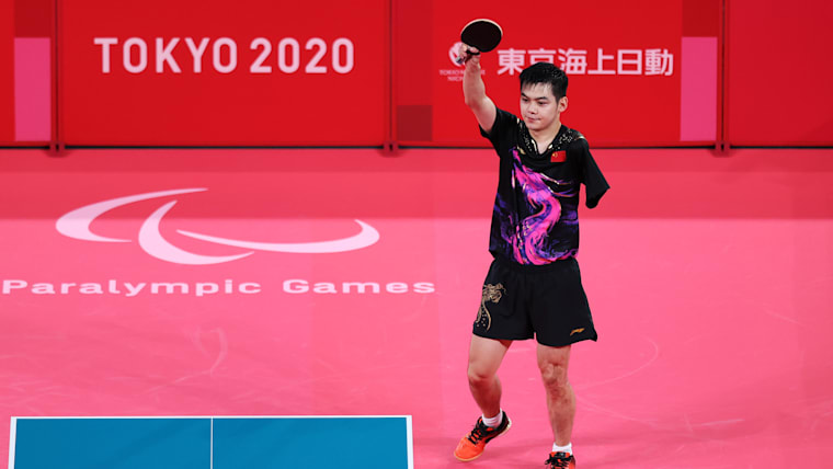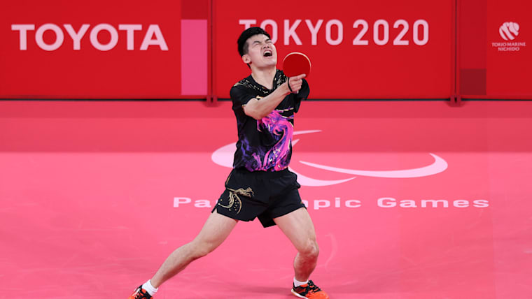 TOKYO, JAPAN - AUGUST 30: Shuai Zhao of Team Republic of China celebrates at match point after winning the Gold medal in the Men's Single Final C8 category on day 6 of the Tokyo 2020 Paralympic Games at Tokyo Metropolitan Gymnasium on August 30, 2021 in Tokyo, Japan. (Photo by Naomi Baker/Getty Images)