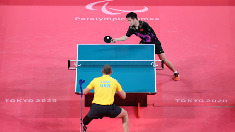 TOKYO, JAPAN - AUGUST 30: Viktor Didukh of Team Ukraine returns a shot against Shuai Zhao of Team Republic of China in the Men's Single Final C8 category on day 6 of the Tokyo 2020 Paralympic Games at Tokyo Metropolitan Gymnasium on August 30, 2021 in Tokyo, Japan. (Photo by Naomi Baker/Getty Images)