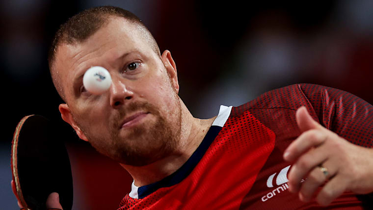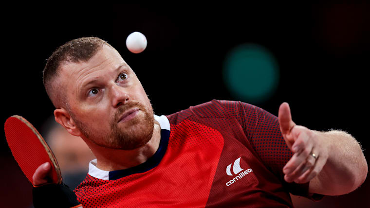 TOKYO, JAPAN - AUGUST 30: Fabien Lamirault of Team France serves during the Men's Table Tennis Singles - Class 2 Final of the Tokyo 2020 Paralympic Games at Tokyo Metropolitan Gymnasium on August 30, 2021 in Tokyo, Japan. (Photo by Buda Mendes/Getty Images)