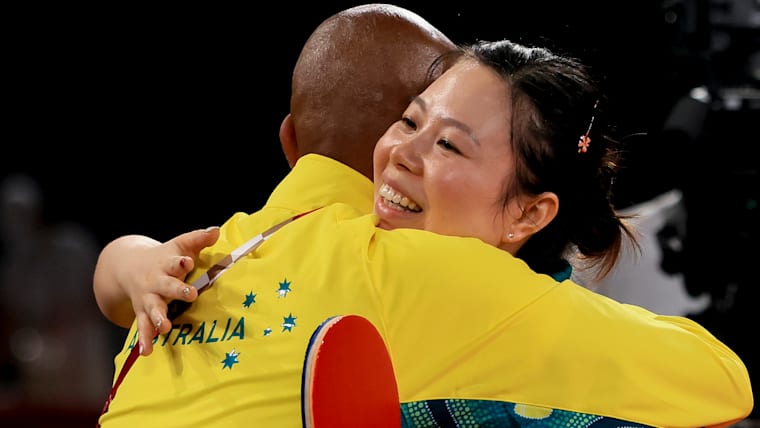 TOKYO, JAPAN - AUGUST 30: Na Li Lei of Team Australia celebrates with her coach after winning the Gold medal during the Women's Table Tennis Singles - Class 9 Final Match of the Tokyo 2020 Paralympic Games at Tokyo Metropolitan Gymnasium on August 30, 2021 in Tokyo, Japan. (Photo by Buda Mendes/Getty Images)