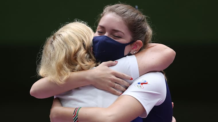 ASAKA, JAPAN - JULY 30: Gold Medalist Vitalina Batsarashkina of Team ROC hugs her coach following the 25m Pistol Women's Finals on day seven of the Tokyo 2020 Olympic Games at Asaka Shooting Range on July 30, 2021 in Asaka, Saitama, Japan. (Photo by Kevin C. Cox/Getty Images)