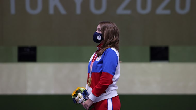 ASAKA, JAPAN - JULY 30: Gold Medalist Vitalina Batsarashkina of Team ROC poses on the podium following the 25m Pistol Women's Finals on day seven of the Tokyo 2020 Olympic Games at Asaka Shooting Range on July 30, 2021 in Asaka, Saitama, Japan. (Photo by Kevin C. Cox/Getty Images)