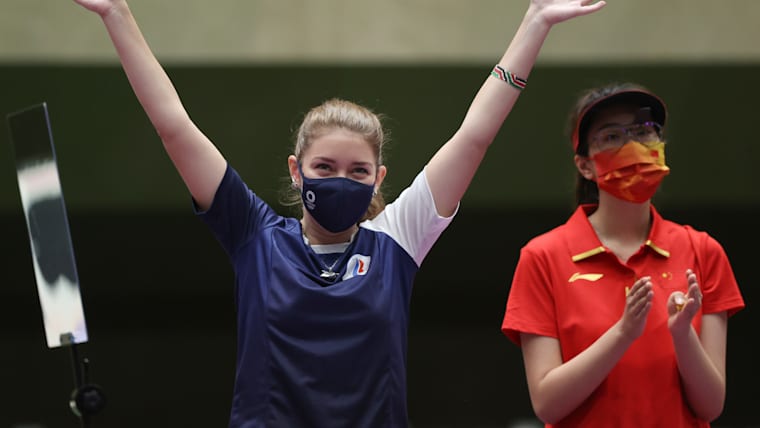 ASAKA, JAPAN - JULY 30: (L-R) Gold Medalist Vitalina Batsarashkina of Team ROC and Bronze Medalist Jiaruixuan Xiao of Team China following the 25m Pistol Women's Finals on day seven of the Tokyo 2020 Olympic Games at Asaka Shooting Range on July 30, 2021 in Asaka, Saitama, Japan. (Photo by Kevin C. Cox/Getty Images)