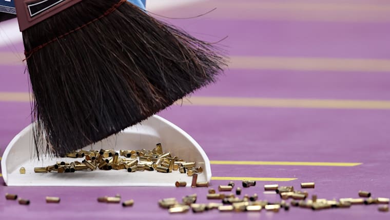 ASAKA, JAPAN - JULY 30: A volunteer sweeps up shell casings during 25m Pistol Women's Qualification on day seven of the Tokyo 2020 Olympic Games at Asaka Shooting Range on July 30, 2021 in Asaka, Saitama, Japan. (Photo by Kevin C. Cox/Getty Images)