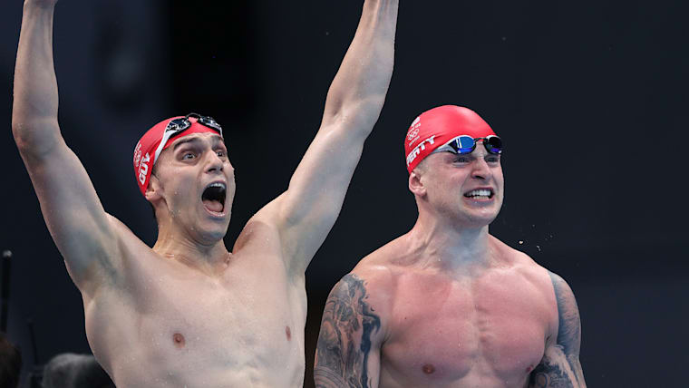 TOKYO, JAPAN - JULY 31: James Guy of Team Great Britain (L) and Adam Peaty of Team Great Britain celebrate winning gold in the Mixed 4 x 100m Medley Relay Final at Tokyo Aquatics Centre on July 31, 2021 in Tokyo, Japan. (Photo by Maddie Meyer/Getty Images)